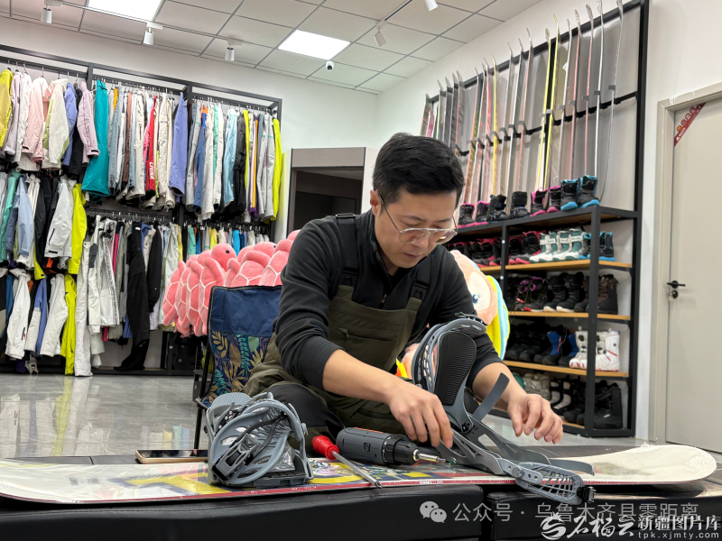彩虹雪雪具库负责人贺秦正在为客人组装雪具。石榴云/新疆日报记者 王晶晶摄